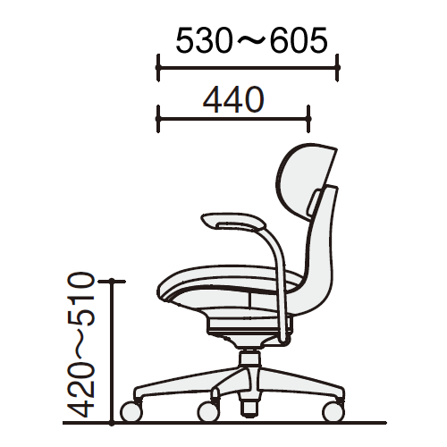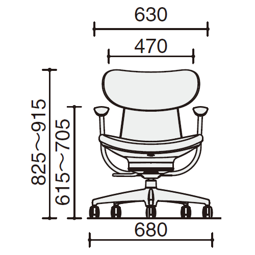 幅:630 / 奥行:530~605mm / 高さ:825~915mm / 座幅:570mm / 脚羽径:680mm / 座奥行:440mm / 座高:420~510mm / 肘高:615~705mm |