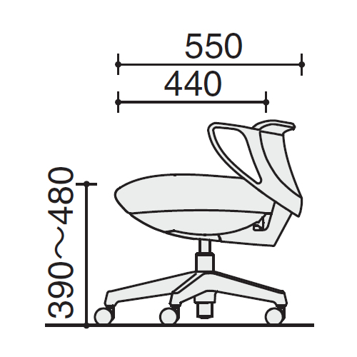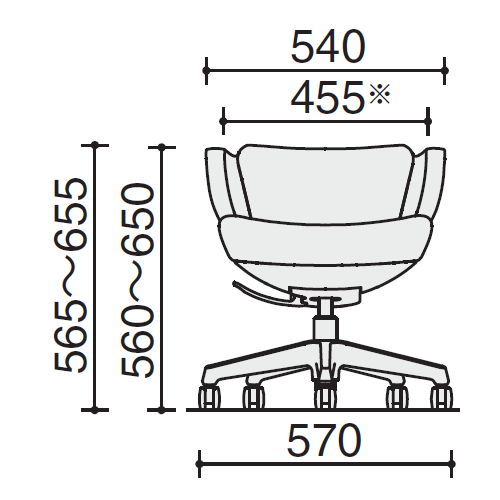 幅:540mm / 奥行:550mm / 高さ:565~655mm / 座幅:480mm / 座奥行:440mm / 座面高さ:390~480mm / 肘掛高さ:560~650mm / 肘内間寸法(肘先端部):455mm / 脚羽根径:570mm |