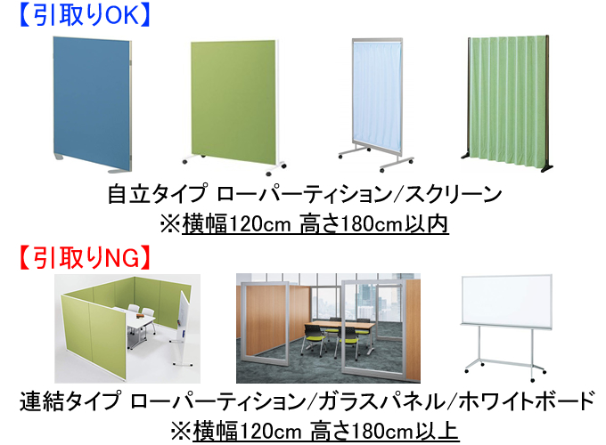 新規ご購入数と同数まで既存ローパーティション・スクリーンを無料で引取りさせて頂きます。 対象品は自立タイプのローパーティション・スクリーン等とさせて頂きます。 ※不要家具の寸法は横幅1200mm・高さ1800mm以内とさせて頂きます。 ※連結タイプのローパーティション・ガラスパネル・ホワイトボードは引取り対象外とさせて頂きます。 ※不要家具引取り有りの場合、納品時間帯は午後とさせて頂きます。 ※一旦回収した不要家具は返却不可能とさせて頂きます。 ※マニュフェストの発行は対応しておりません。