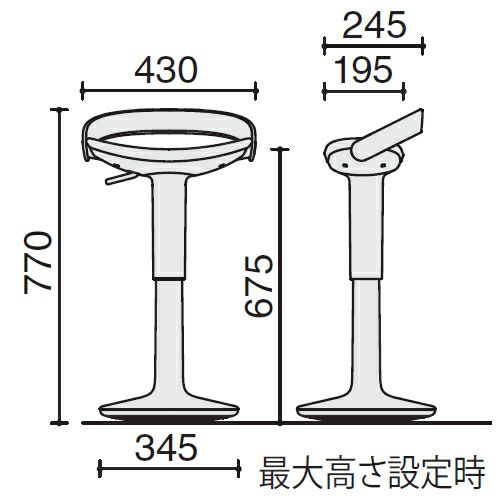 幅:430mm(脚部345mm) / 奥行:245mm(脚部345mm) / 高さ:770~580mm / 座幅:410mm / 座奥行:195mm / 座高:675~485mm / 自重5.4kg |