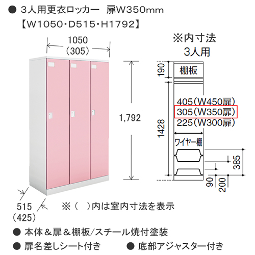 本体・扉・上棚板/スチール、焼付塗装 上棚板耐荷重:約10kgf ワイヤー棚/スチール、樹脂塗装 ワイヤー棚耐荷重:約5kgf ハンガーパイプ/径20mm スチール、焼付塗装 コートフック/樹脂成型品 鏡枠/樹脂成型品 扉トレー/樹脂成型品 扉トレー耐荷重:約1kgf 扉フック/樹脂成型品 扉フック耐荷重:約0.5kgf ●付属品 ネームプレート(ネーム用紙付き)、連結用ボルト・ナット(連結穴キャップ付き)、水平調整アジャスター付き |