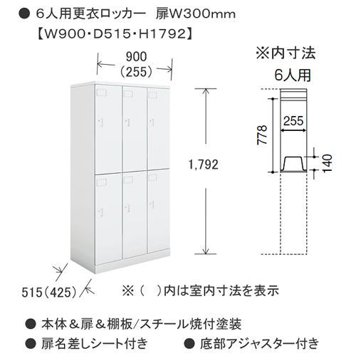本体・扉/スチール、焼付塗装 ワイヤー棚/スチール、樹脂塗装 ワイヤー棚耐荷重:約5kgf ハンガーパイプ/径20mm スチール、焼付塗装 コートフック/樹脂成型品 扉トレー/樹脂成型品 扉トレー耐荷重:約1kgf ●付属品 ネームプレート(ネーム用紙付き)、連結用ボルト・ナット(連結穴キャップ付き)、水平調整アジャスター付き |