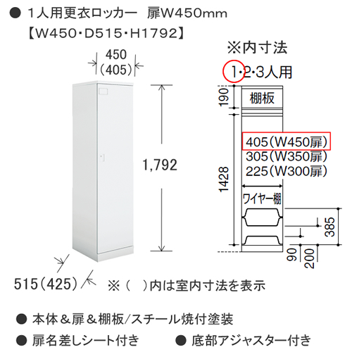 本体・扉・上棚板/スチール、焼付塗装 上棚板耐荷重:約10kgf ワイヤー棚/スチール、樹脂塗装 ワイヤー棚耐荷重:約5kgf ハンガーパイプ/径20mm スチール、焼付塗装 コートフック/樹脂成型品 鏡枠/樹脂成型品 扉トレー/樹脂成型品 扉トレー耐荷重:約1kgf 扉フック/樹脂成型品 扉フック耐荷重:約0.5kgf ●付属品 ネームプレート(ネーム用紙付き)、連結用ボルト・ナット(連結穴キャップ付き)、水平調整アジャスター付き |