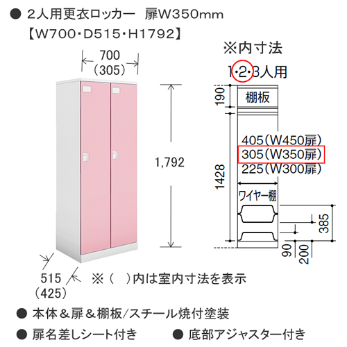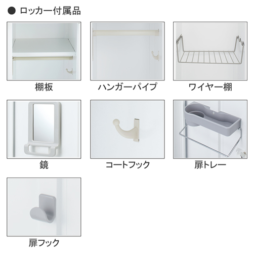 本体・扉・上棚板/スチール、焼付塗装 上棚板耐荷重:約10kgf ワイヤー棚/スチール、樹脂塗装 ワイヤー棚耐荷重:約5kgf ハンガーパイプ/径20mm スチール、焼付塗装 コートフック/樹脂成型品 鏡枠/樹脂成型品 扉トレー/樹脂成型品 扉トレー耐荷重:約1kgf 扉フック/樹脂成型品 扉フック耐荷重:約0.5kgf ●付属品 ネームプレート(ネーム用紙付き)、連結用ボルト・ナット(連結穴キャップ付き)、水平調整アジャスター付き |
