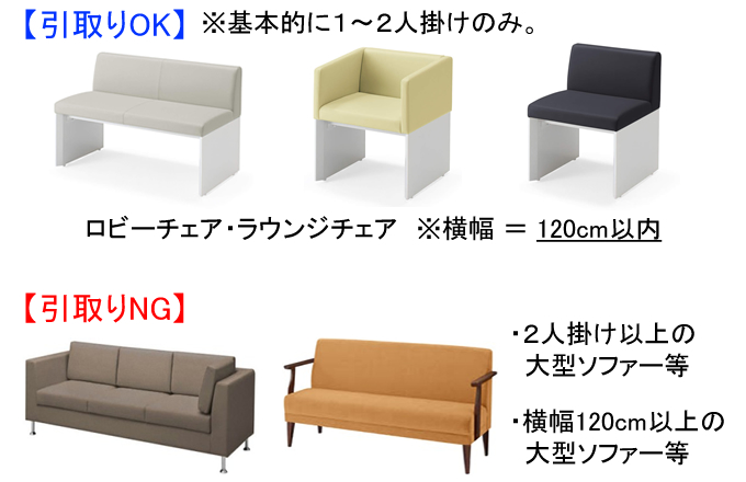 新規ご購入数と同数まで既存チェア類を有料で引取りさせて頂きます。 対象品は2人掛けのラウンジチェア・ソファ等とさせて頂きます。 ※不要家具の寸法は横幅120cm以内とさせて頂きます。 ※2人掛以上の大型ソファー等は対象外とさせて頂きます。 ※不要家具引取り有りの場合、納品時間帯は午後とさせて頂きます。 ※一旦回収した不要家具は返却不可能とさせて頂きます。 ※マニュフェストの発行は対応しておりません。