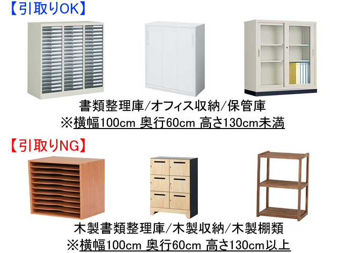 新規ご購入数と同数まで既存書類整理庫・オフィス収納庫・保管庫を有料で引取りさせて頂きます。 ※不要家具の寸法は横幅1000mm・奥行600mm・高さ1300mm未満とさせて頂きます。 ※木製書類整理庫・木製収納・木製棚類は引取り対象外とさせて頂きます。 ※不要家具引取り有りの場合、納品時間帯は午後とさせて頂きます。 ※一旦回収した不要家具は返却不可能とさせて頂きます。 ※マニュフェストの発行は対応しておりません。