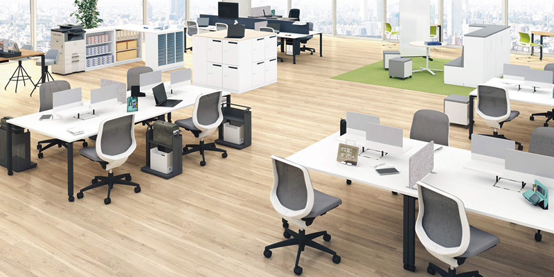 変化が早い現代のオフィスシーンで効率性・快適性を確保・維持するには、 レイアウト変更に柔軟に対応するバリエーションが豊富なデスクを導入することが重要であるといえます。