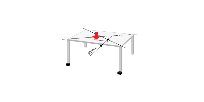 試験体を床面に設置し、試験体の長辺側の脚をストッパに当て、ストッパ側の天板の縁から50mm内側の位置に規定の垂直力を加えるか、反対側の脚が浮き上がるまでの垂直力を測定します。